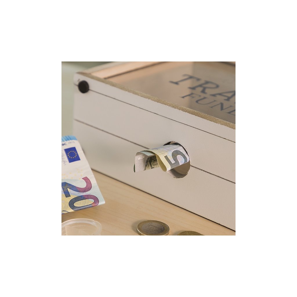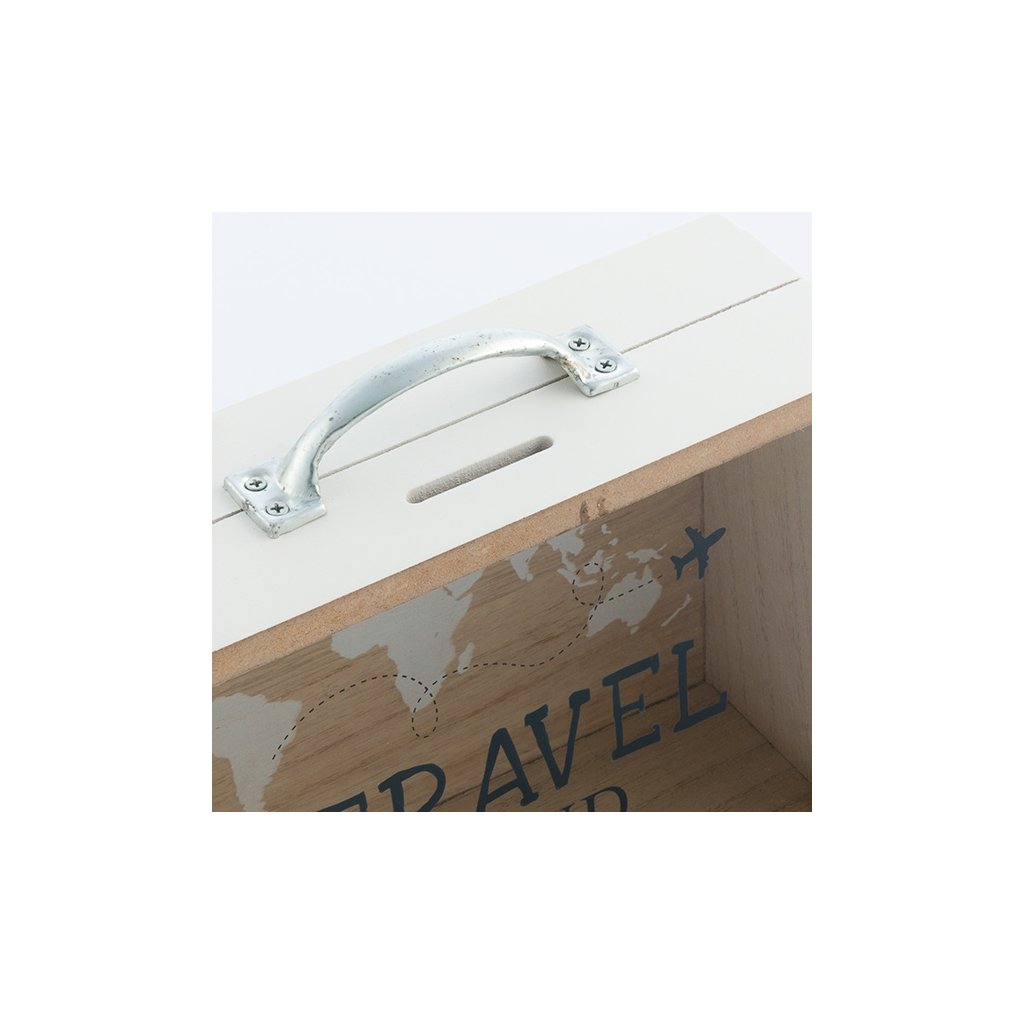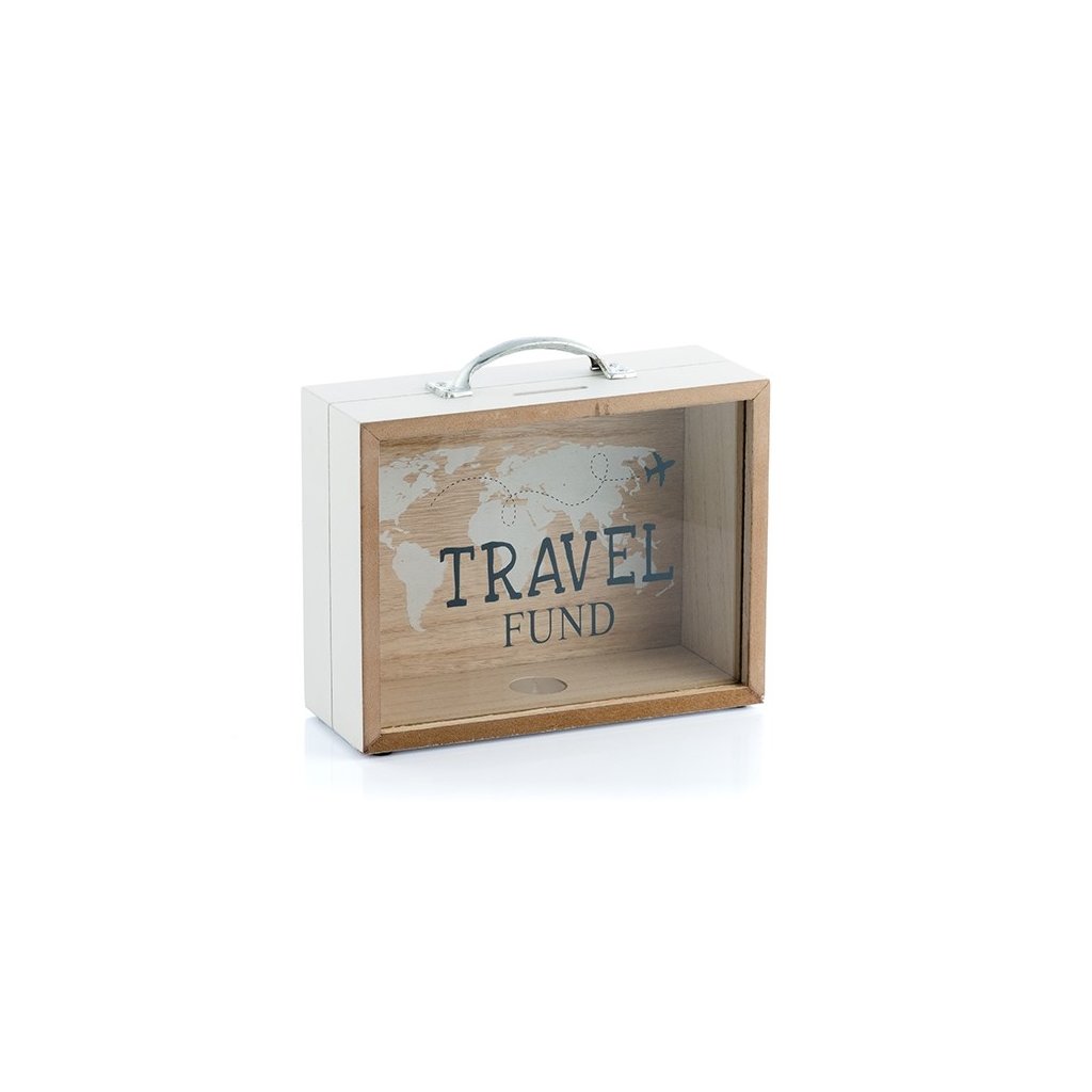 Pușculiță frumoasă din lemn, în care o să economisiți pentru călătoria de vis. Cu mâner practic din metal pentru transport și cu un capac de sticlă, ca să știți exact, câți bani ați economisit.